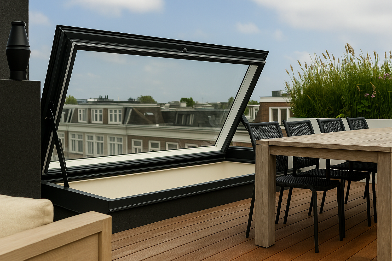 Beloopbare dakluik – uniek in Nederland. Ideaal voor dakterrassen of straatniveau, zoals op woonboten of bij koekoeken. Altijd elektrisch, eenvoudig te installeren en geleverd in één, maximale maat – perfect afgestemd op glasgewicht en motorkracht. Onze experts staan klaar om te helpen.